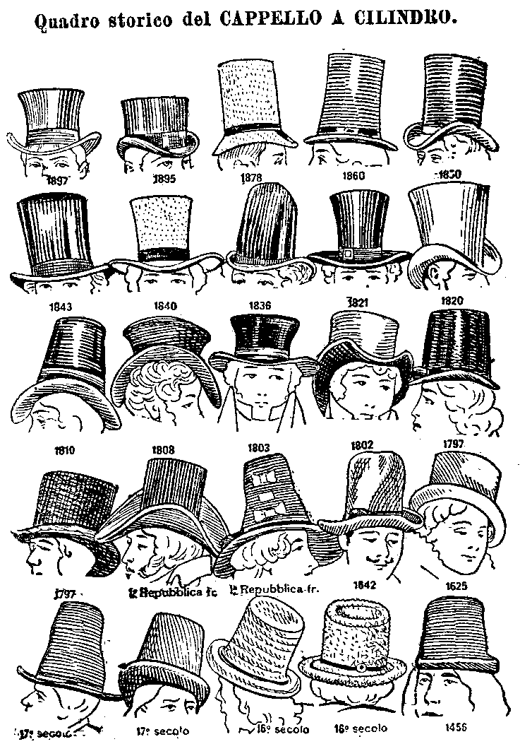 st. Data dal 15° sec. Allora era di feltro opaco, senza tese, e col cocuzzolo a forma di cono. In Francia, comparve nel 1793; e, la prima volta, a Londra, nel 1797. La Rivoluzione francese lo mise di moda; e, presso alcune nazioni, il cappello a cilindro divenne, contro l'usato bicorno ricamato, il segno della libertà!